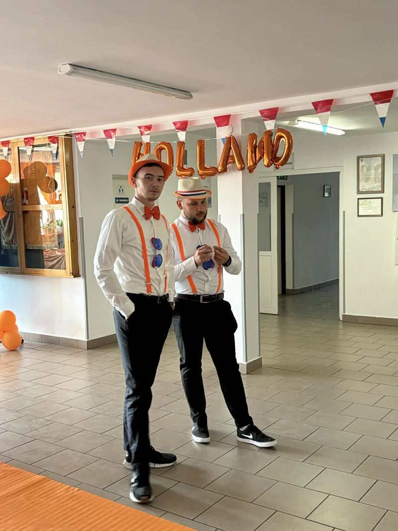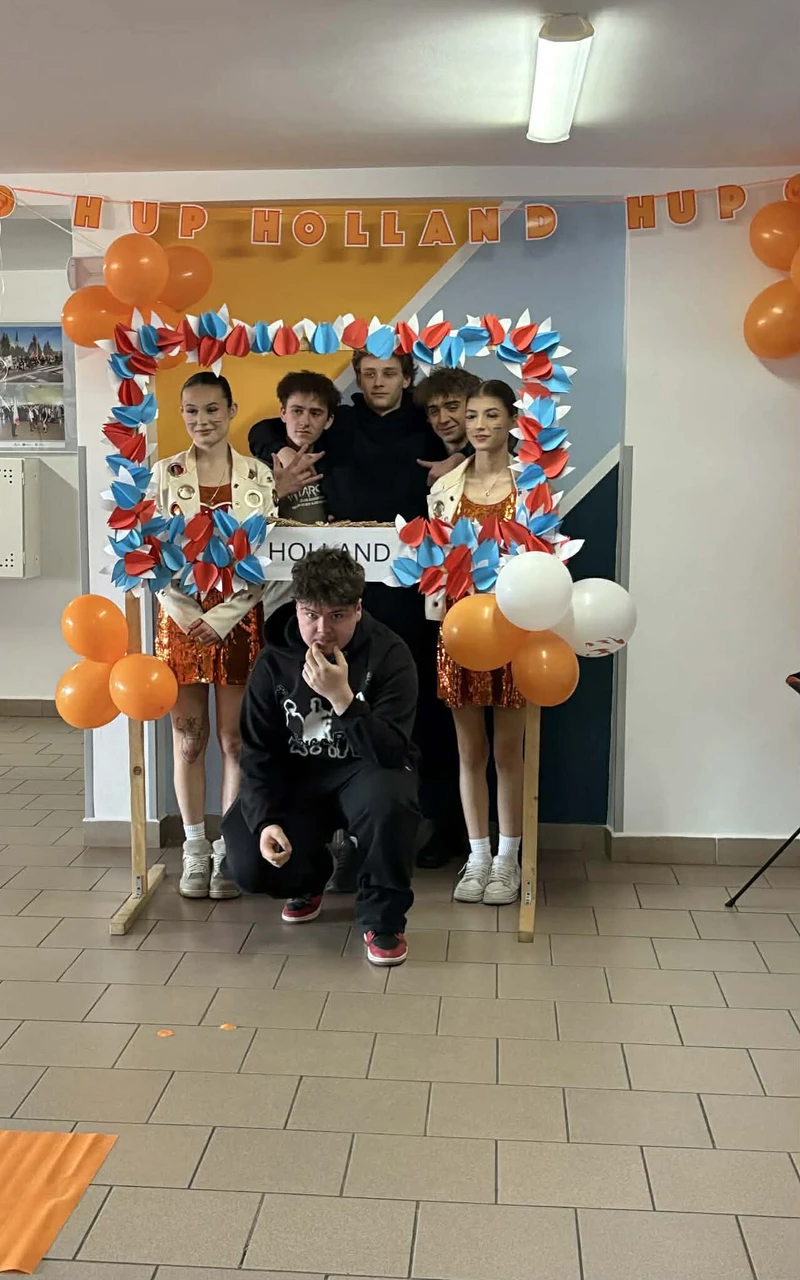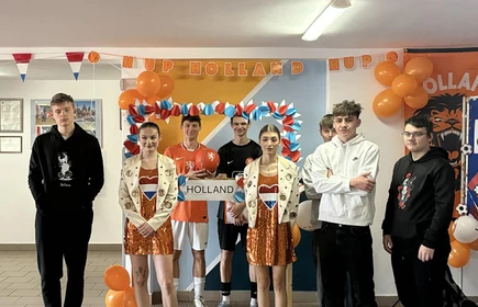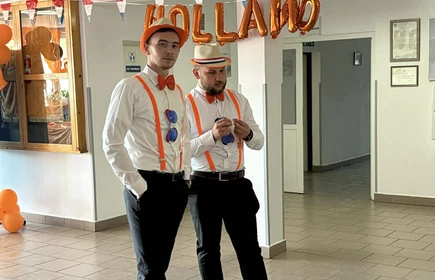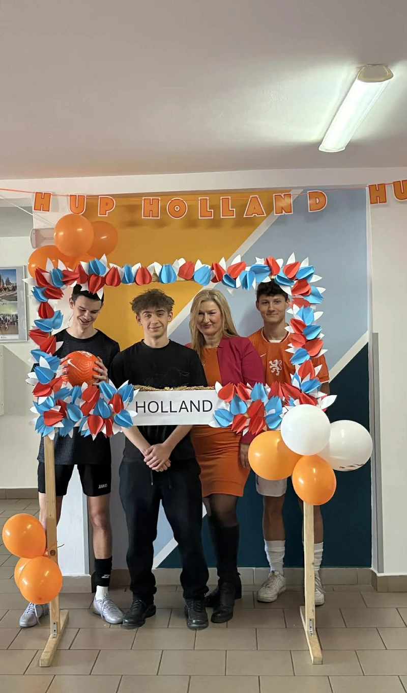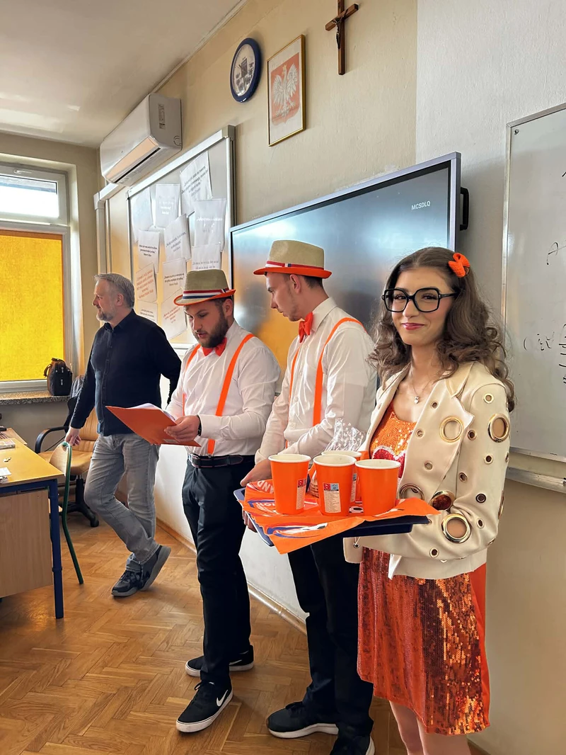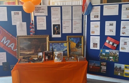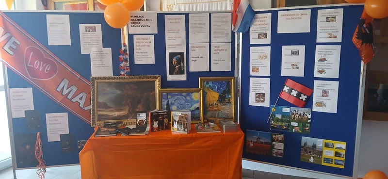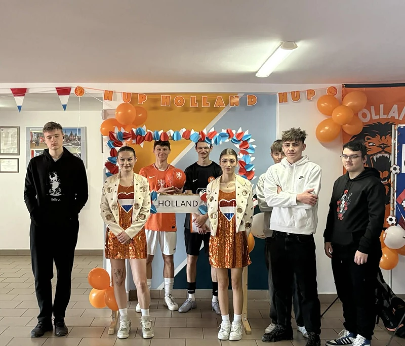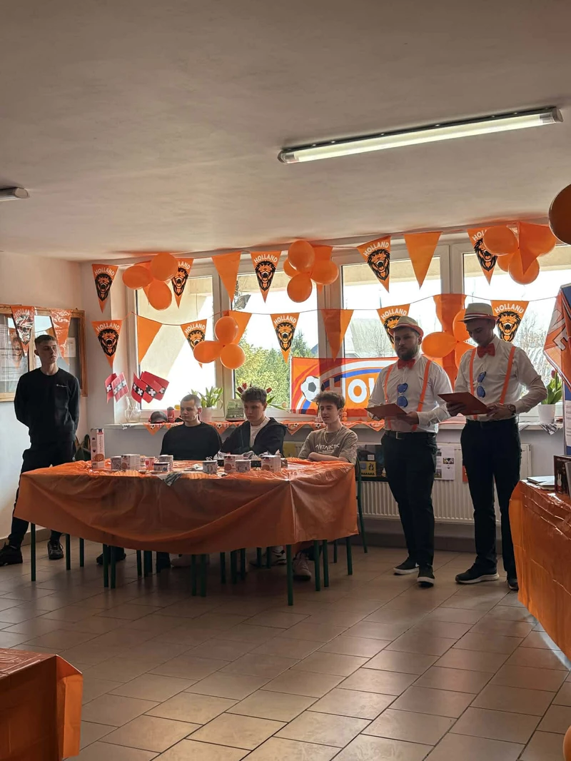 Na początek została nam zaprezentowana wyjątkowa Holandia – po wejściu do szkoły zauważyliśmy mieniące się na pomarańczowo-biało-niebiesko piękne dekoracje, odwołujące się do popularnych symboli tego kraju. Nasi koledzy zapoznawali nas z obrazami najsłynniejszych malarzy holenderskich, podziwialiśmy m.in. reprodukcję „Pejzażu z miłosiernym Samarytaninem”, oglądaliśmy tradycyjne maskotki – króliczki, które każde dziecko otrzymuje w dniu narodzin. Chłopcy z klasy II i III technikum ubrani w stroje klubów piłki nożnej, przedstawiali sylwetki gwiazd futbolowych, poznaliśmy także zasady gry w golfa, ponieważ Holendrzy są wielkimi amatorami tego sportu. To jednak nie wszystkie atrakcje, które dla nas przygotowała nasza anglistka: degustowaliśmy oryginalne sery holenderskie, zajadaliśmy się wspaniałymi herbatnikami stroopwafels, oraz tradycyjnym pomarańczowym ciastem tortowym. Uczniowie przeprowadzili „Quiz wiedzy o Holandii”, najlepsi obdarowywani byli pysznymi cukierkami.