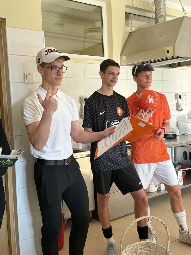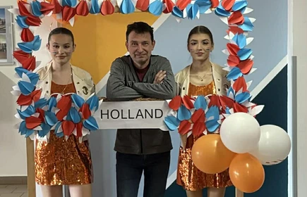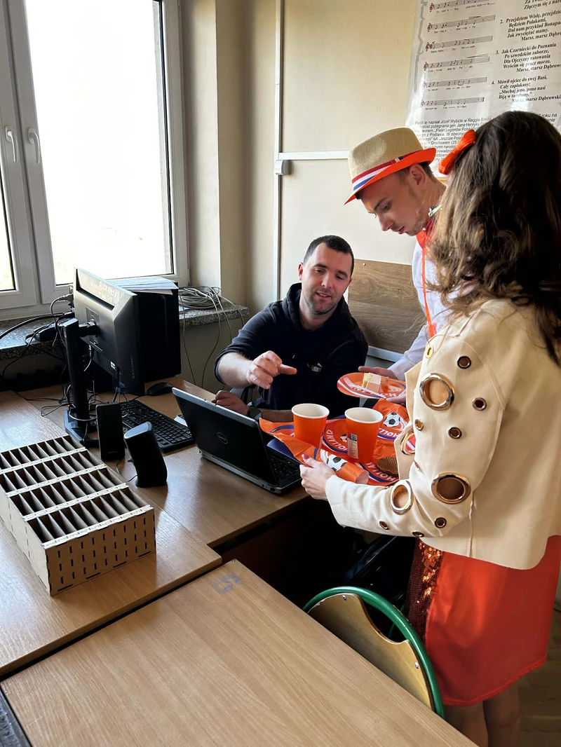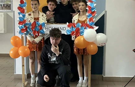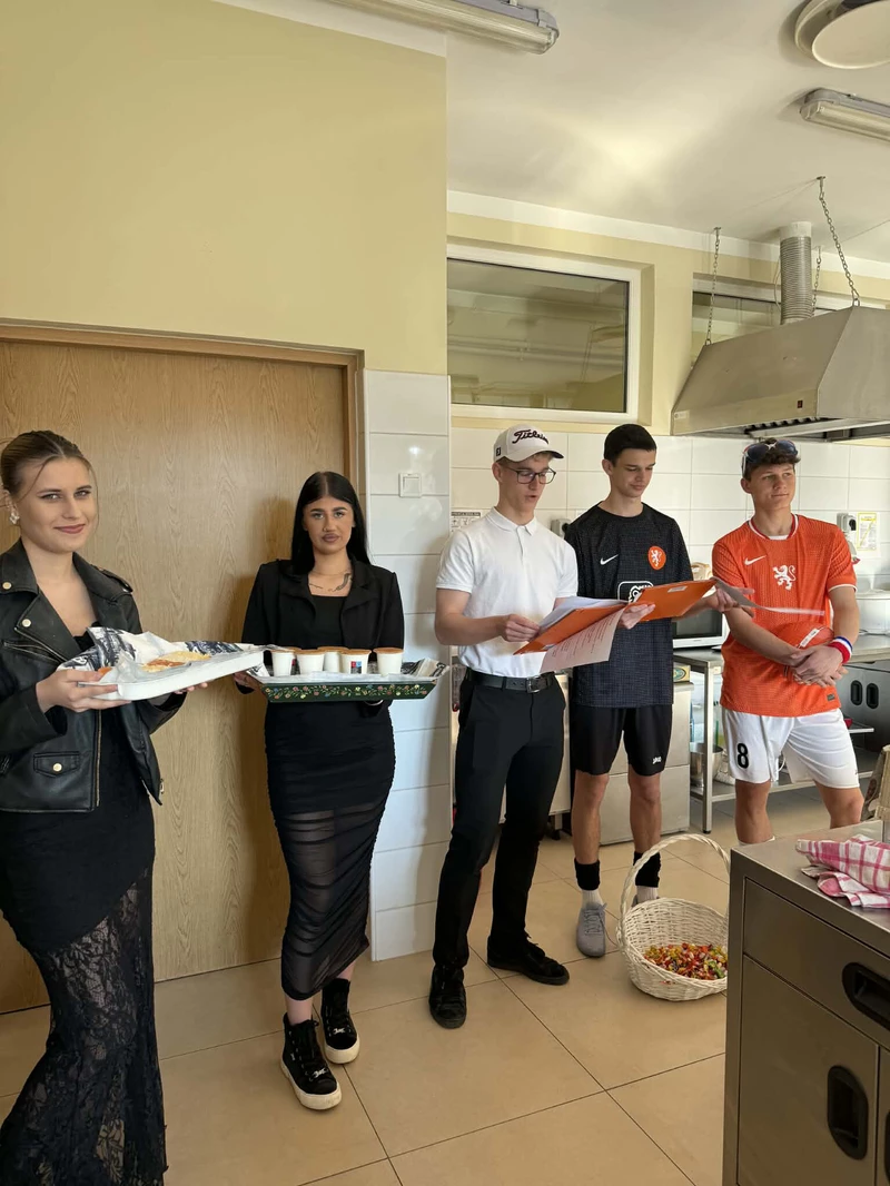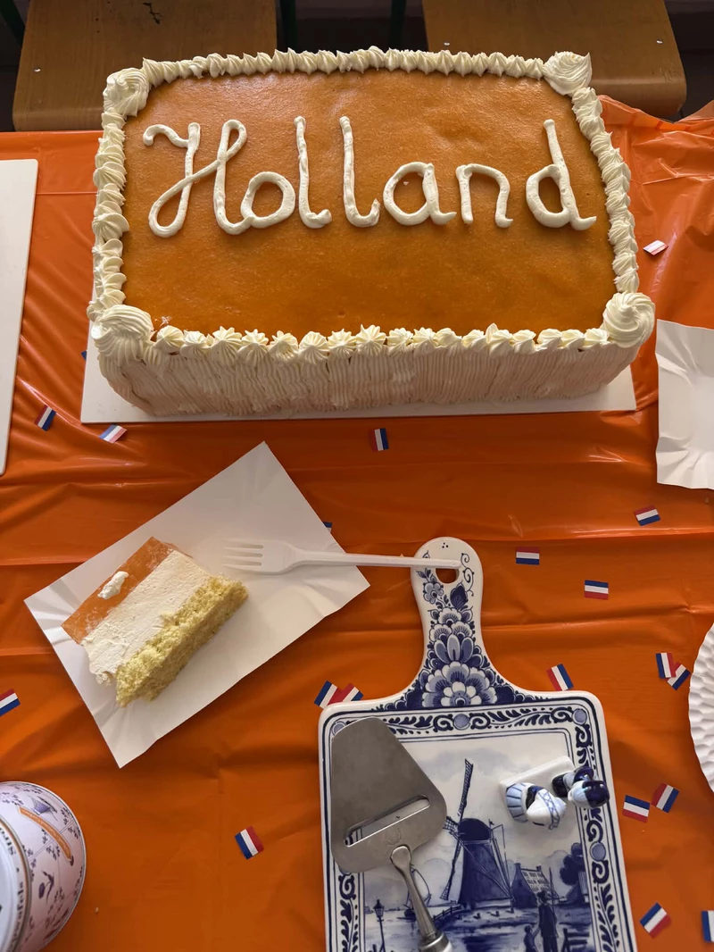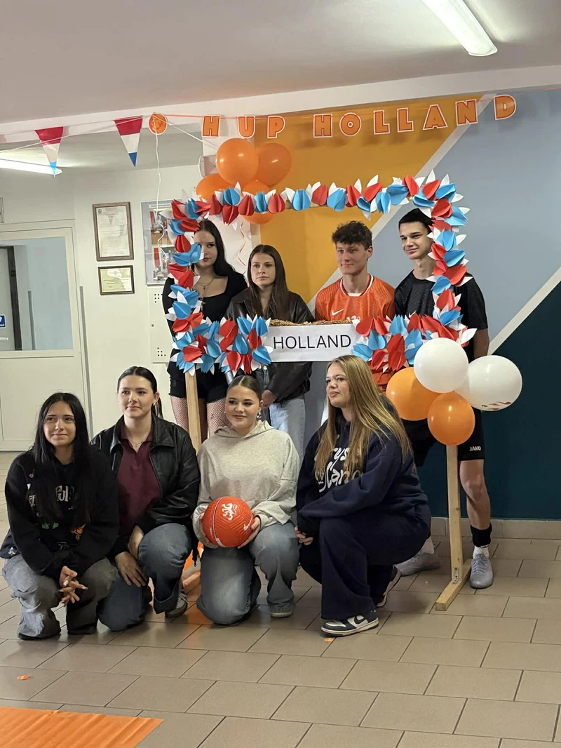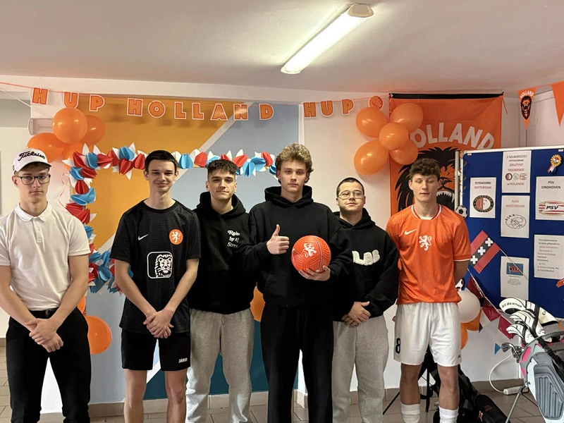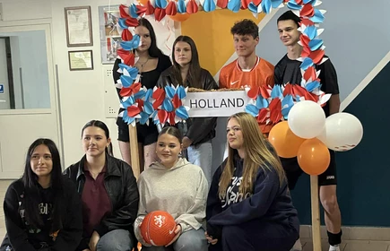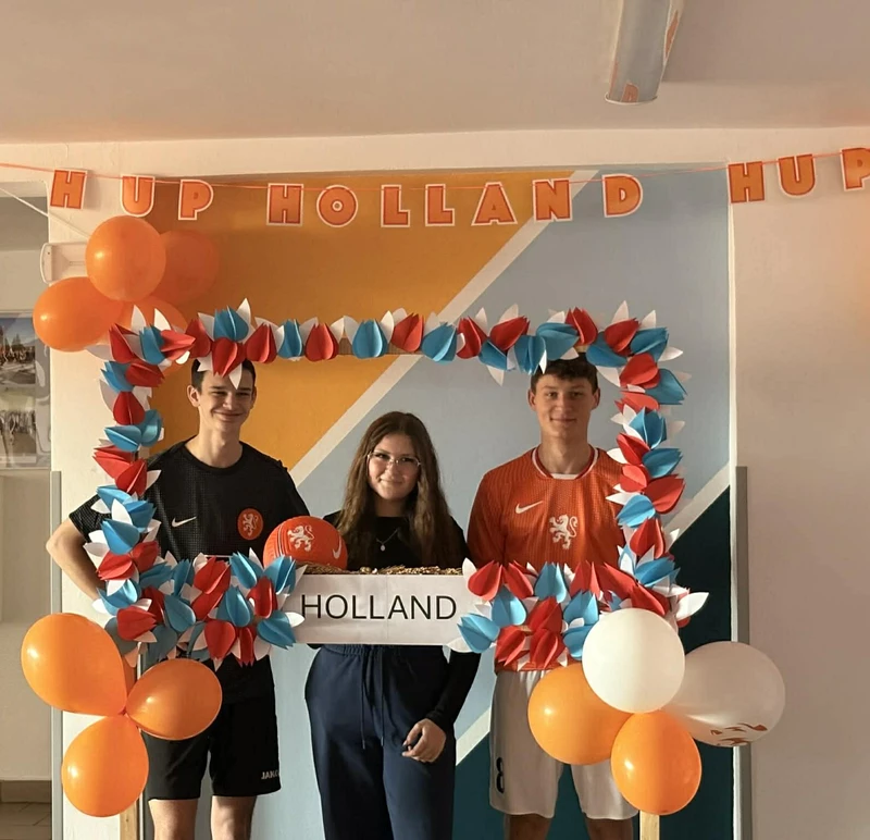 Na początek została nam zaprezentowana wyjątkowa Holandia – po wejściu do szkoły zauważyliśmy mieniące się na pomarańczowo-biało-niebiesko piękne dekoracje, odwołujące się do popularnych symboli tego kraju. Nasi koledzy zapoznawali nas z obrazami najsłynniejszych malarzy holenderskich, podziwialiśmy m.in. reprodukcję „Pejzażu z miłosiernym Samarytaninem”, oglądaliśmy tradycyjne maskotki – króliczki, które każde dziecko otrzymuje w dniu narodzin. Chłopcy z klasy II i III technikum ubrani w stroje klubów piłki nożnej, przedstawiali sylwetki gwiazd futbolowych, poznaliśmy także zasady gry w golfa, ponieważ Holendrzy są wielkimi amatorami tego sportu. To jednak nie wszystkie atrakcje, które dla nas przygotowała nasza anglistka: degustowaliśmy oryginalne sery holenderskie, zajadaliśmy się wspaniałymi herbatnikami stroopwafels, oraz tradycyjnym pomarańczowym ciastem tortowym. Uczniowie przeprowadzili „Quiz wiedzy o Holandii”, najlepsi obdarowywani byli pysznymi cukierkami.