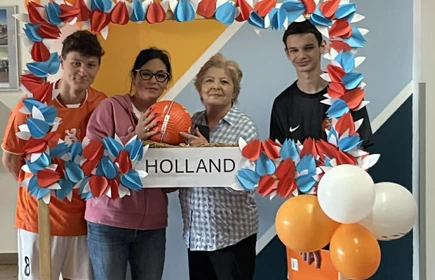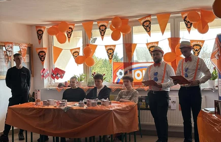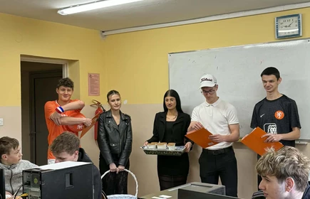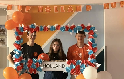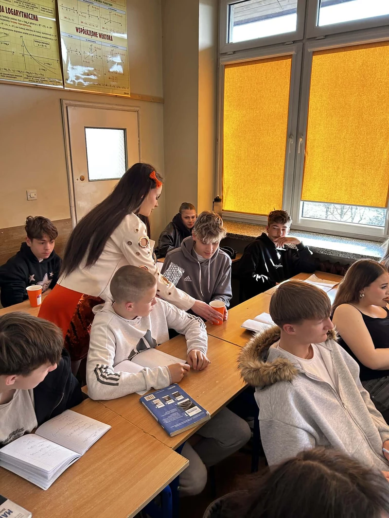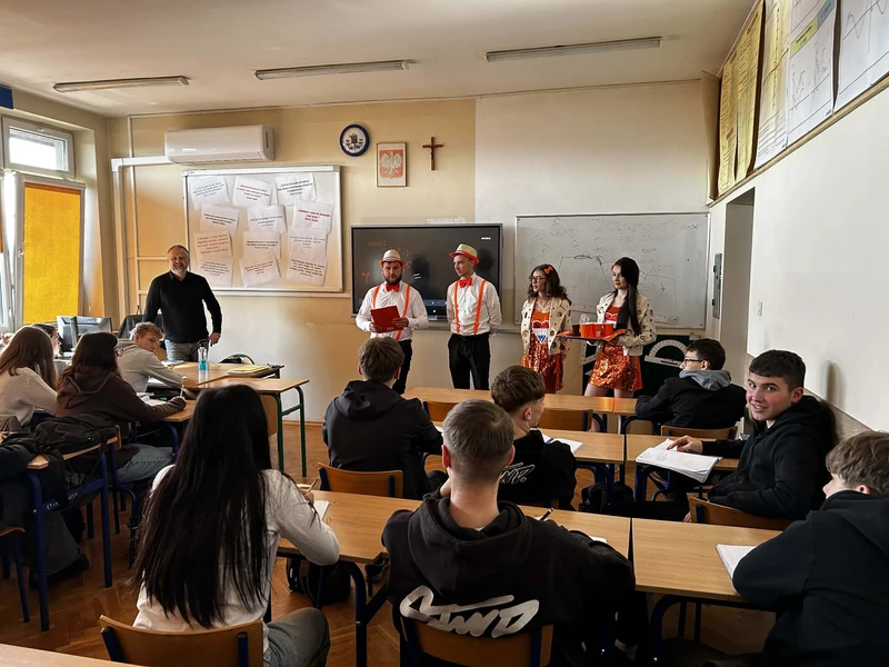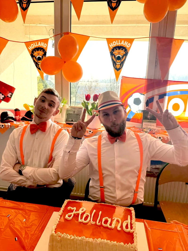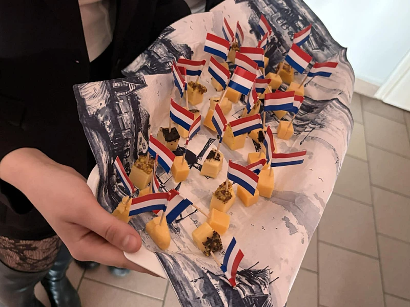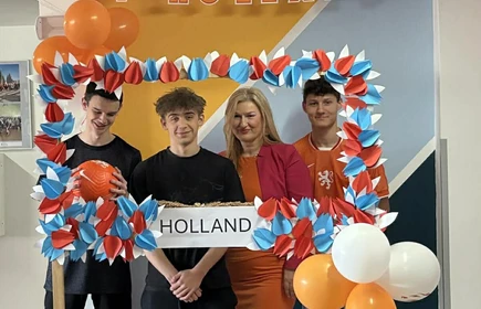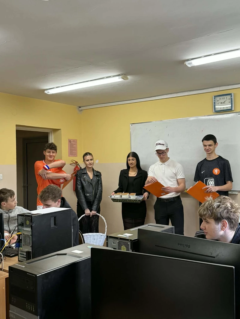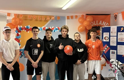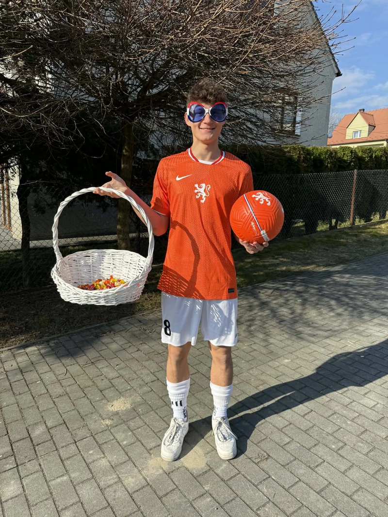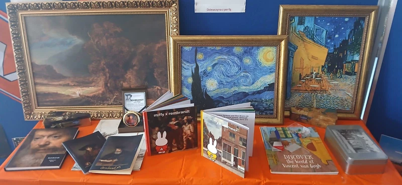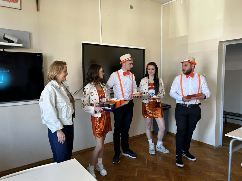 Na początek została nam zaprezentowana wyjątkowa Holandia – po wejściu do szkoły zauważyliśmy mieniące się na pomarańczowo-biało-niebiesko piękne dekoracje, odwołujące się do popularnych symboli tego kraju. Nasi koledzy zapoznawali nas z obrazami najsłynniejszych malarzy holenderskich, podziwialiśmy m.in. reprodukcję „Pejzażu z miłosiernym Samarytaninem”, oglądaliśmy tradycyjne maskotki – króliczki, które każde dziecko otrzymuje w dniu narodzin. Chłopcy z klasy II i III technikum ubrani w stroje klubów piłki nożnej, przedstawiali sylwetki gwiazd futbolowych, poznaliśmy także zasady gry w golfa, ponieważ Holendrzy są wielkimi amatorami tego sportu. To jednak nie wszystkie atrakcje, które dla nas przygotowała nasza anglistka: degustowaliśmy oryginalne sery holenderskie, zajadaliśmy się wspaniałymi herbatnikami stroopwafels, oraz tradycyjnym pomarańczowym ciastem tortowym. Uczniowie przeprowadzili „Quiz wiedzy o Holandii”, najlepsi obdarowywani byli pysznymi cukierkami.