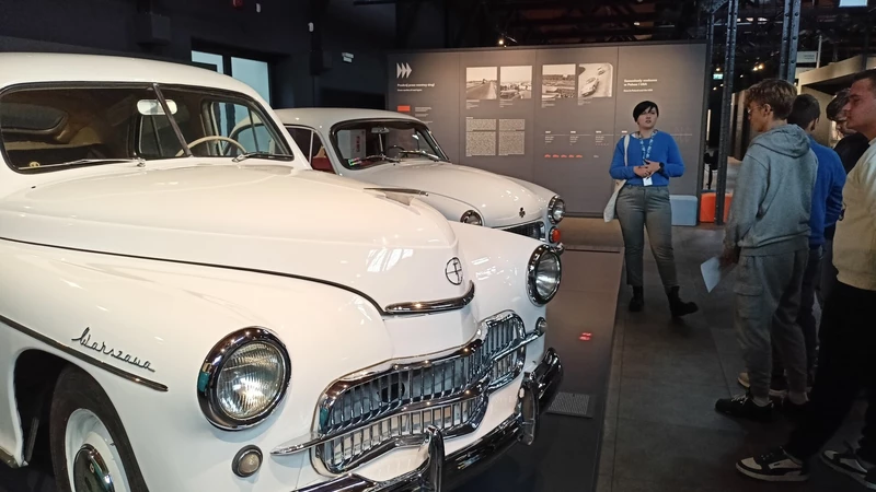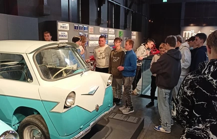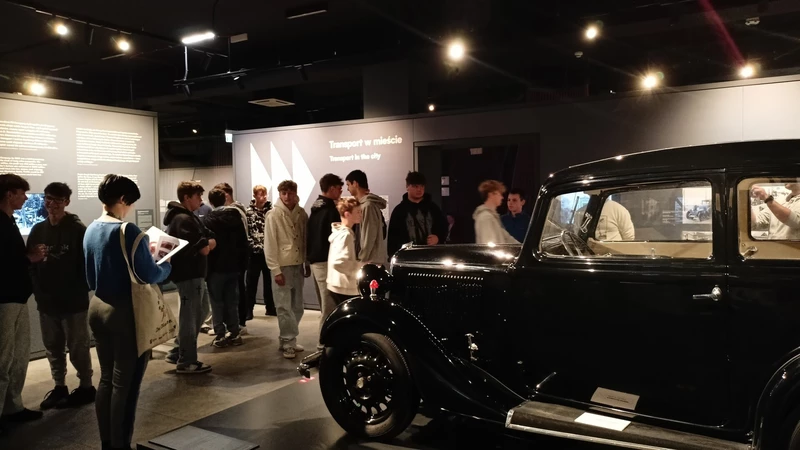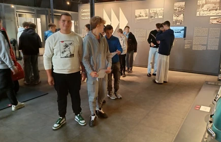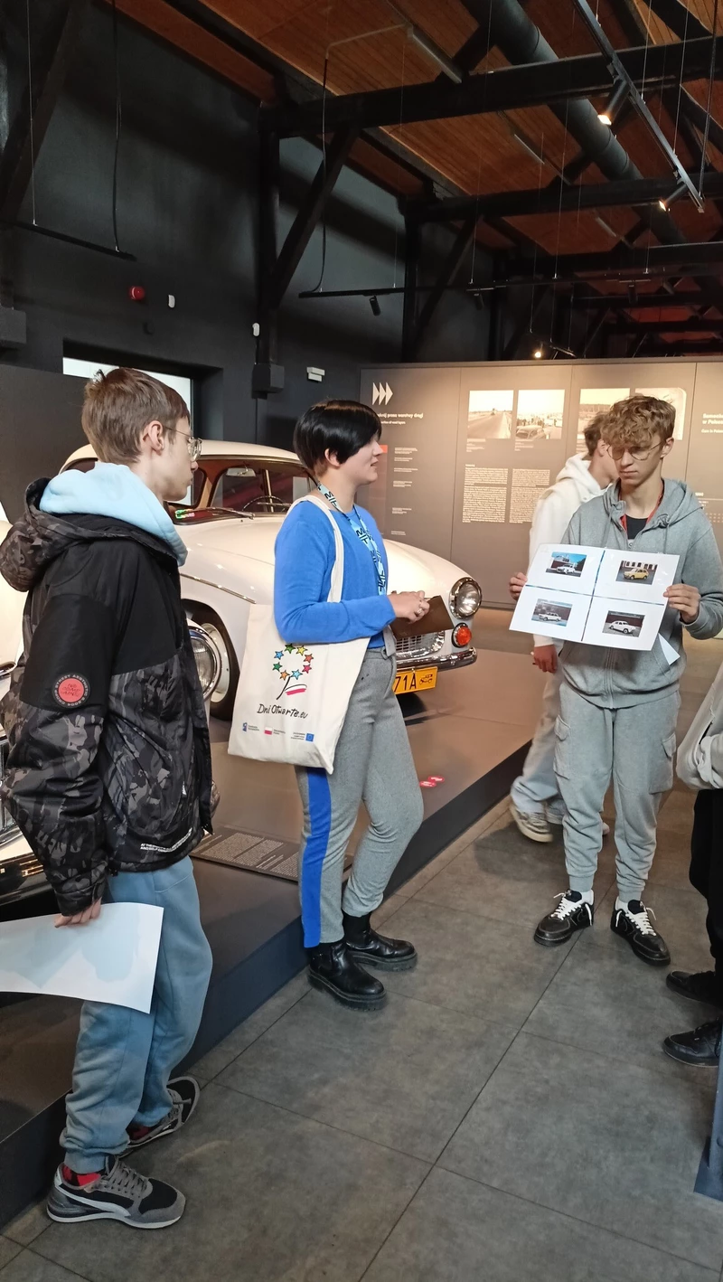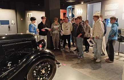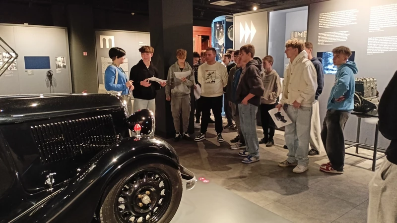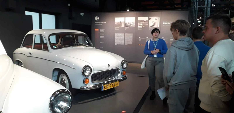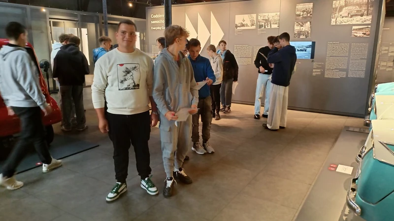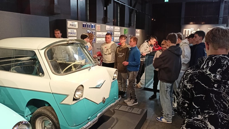 Dnia 26 września 2025 roku uczniowie klasy II i IV technikum udali się do Muzeum Inżynierii i Techniki w Krakowie na lekcję muzealną pod tytułem „O osiągnięciach polskiej motoryzacji”. Zajęcia odbyły się w całości w przestrzeni wystawy pt. „Miasto. Technoczułość”. Wystawa ta jest wyjątkową podróżą w czasie: w przeszłość i przyszłość. Prezentuje miasto z perspektywy 12 dziedzin inżynierii i techniki. Lekcja muzealna, w której czynnie nasi uczniowie brali udział była podróżą po historii czterech kółek. Wędrując po wystawie w towarzystwie edukatorki poznaliśmy polskie marki samochodów. Dowiedzieliśmy się, jakie ciekawe rozwiązania zastosowano w Polskim Fiacie 508, jaki samochód był „królową polskich szos” oraz czym były mikrosamochody. Oprócz wymiaru edukacyjnego, bardzo ważna była także integracja klas. Uczniowie pracowali w grupach, co dawało możliwości poznawania się i akceptacji. Lekcja na terenie muzeum spełniła zatem funkcje wychowawcze. Lekcje muzealne uczą również zachowania się w miejscach publicznych, wyrabiają właściwy stosunek do kultury i historii.