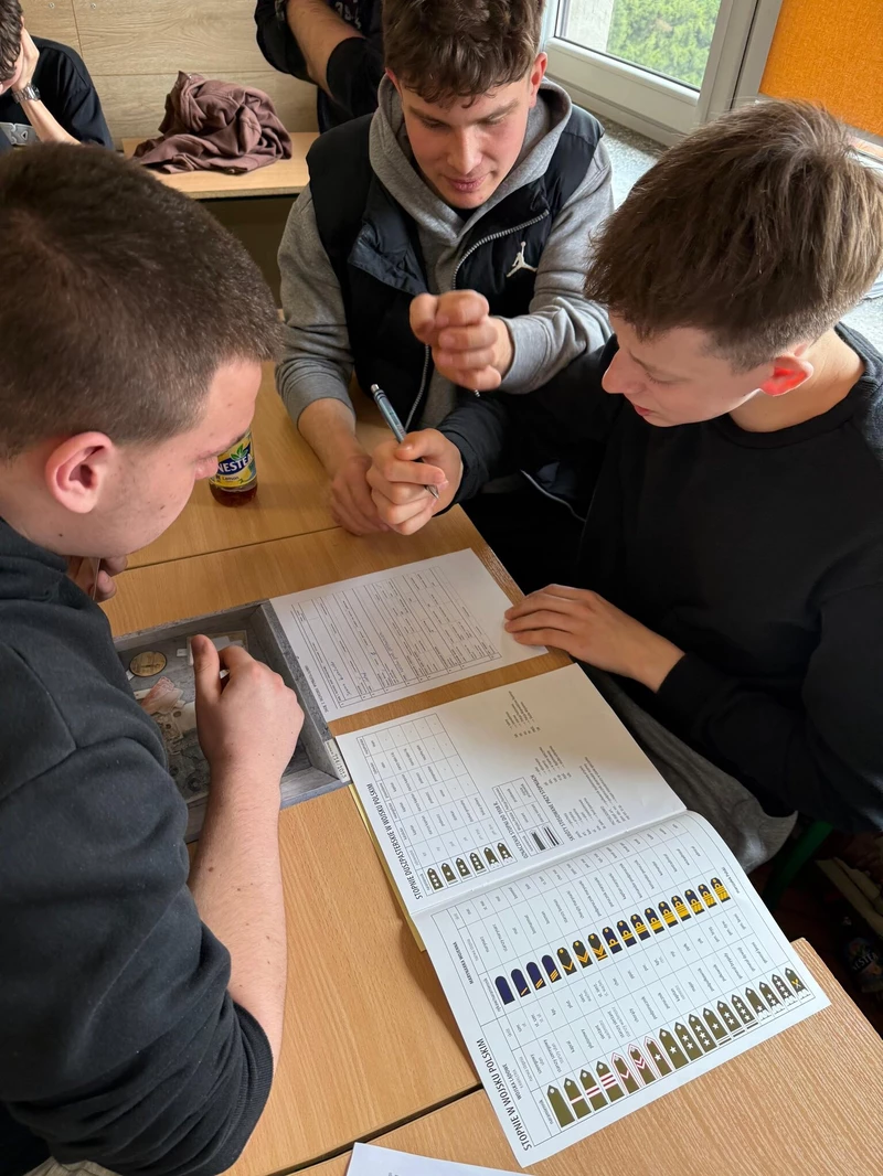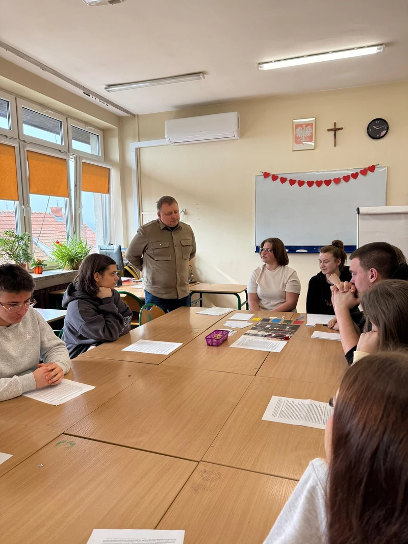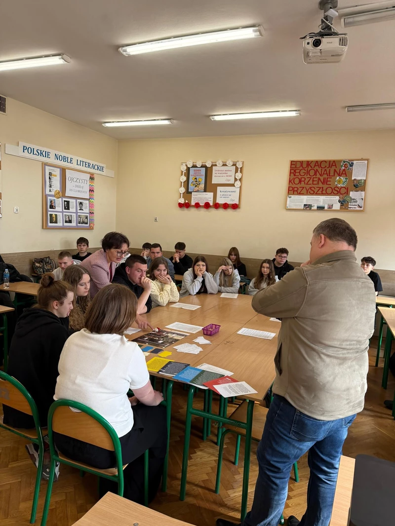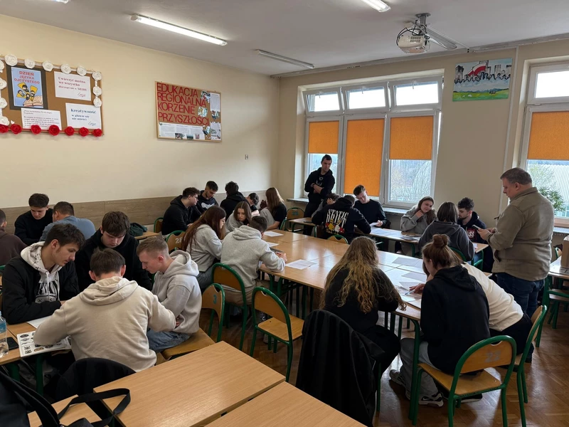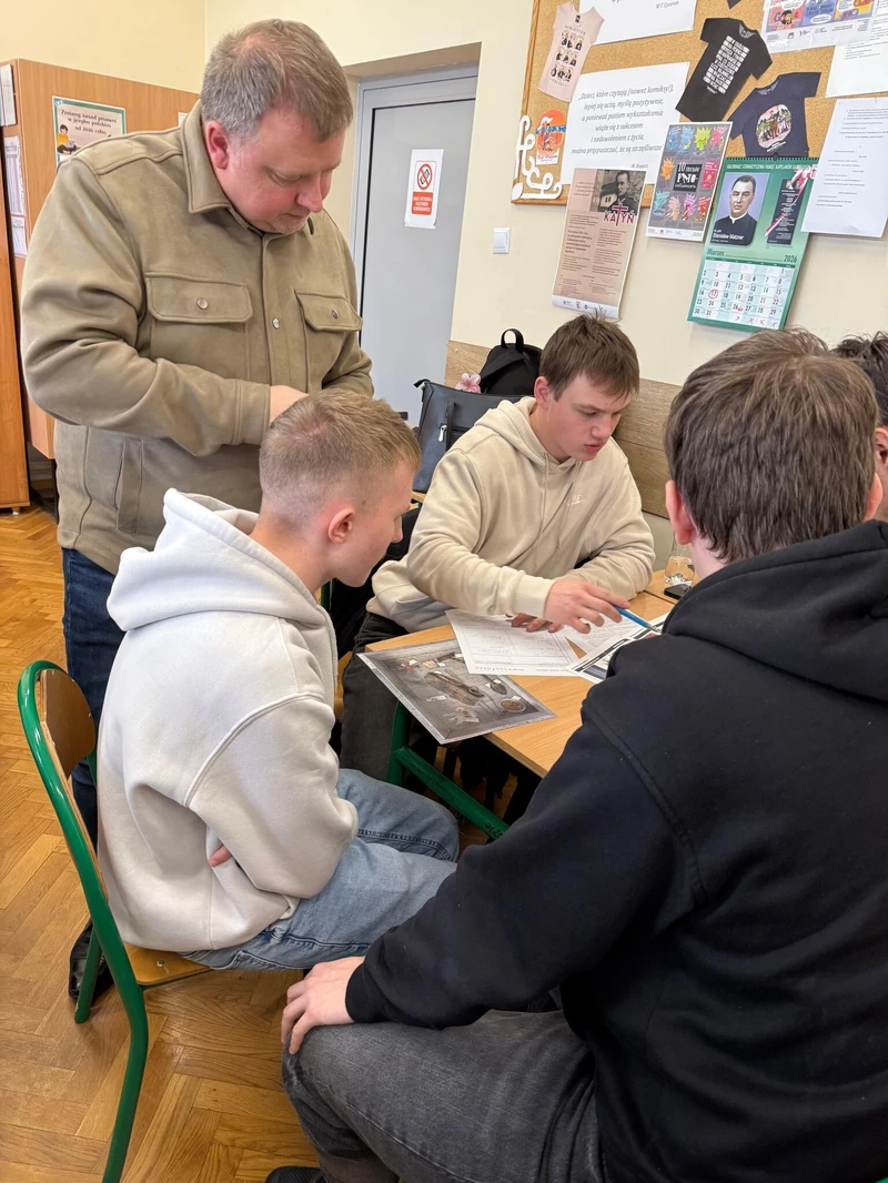 Dnia 16 kwietnia 2026 roku uczniowie Technikum wzięli udział w spotkaniu z Panem Michałem Masłowskim – Naczelnikiem Oddziałowego Biura Edukacji Narodowej IPN w Krakowie. Obecność tak zacnego Gościa związana była z realizowanym w szkole projektem „Silni Polską”, wydarzenie miało charakter edukacyjny i zostało połączone z warsztatami pt. „Śledztwo katyńskie”. Spotkanie rozpoczęło się od prezentacji projektu edukacyjnego opracowanego przez grupę uczniów, efekty pracy spotkały się z ogromna aprobatą Pana Naczelnika, który pogratulował uczniom ciekawego sposobu na promowanie historii regionu. Pan Masłowski nakreślił tło historyczne związane ze zbrodnią katyńską. Uczniowie mieli okazję dowiedzieć się o okolicznościach tego tragicznego wydarzenia, jego przebiegu oraz wieloletnich próbach ukrywania prawdy przez władze Związku Radzieckiego. Główną częścią wydarzenia były warsztaty „Śledztwo katyńskie”, podczas których uczniowie wcielili się w rolę badaczy i historyków. Pracując w grupach, analizowali materiały źródłowe, sprawdzali zawartość „skrzynek katyńskich”, przywracali tożsamość bezimiennym ofiarom. Warsztaty miały charakter interaktywny, co pozwoliło uczniom lepiej zrozumieć proces badania historii oraz trudności związane z dochodzeniem do prawdy. Ważnym aspektem zajęć było także kształtowanie postaw – wrażliwości na los drugiego człowieka, szacunku dla ofiar oraz odpowiedzialności za pielęgnowanie pamięci historycznej. Warsztaty skłaniały do refleksji nad znaczeniem prawdy w życiu społecznym oraz rolą historyków w jej odkrywaniu.