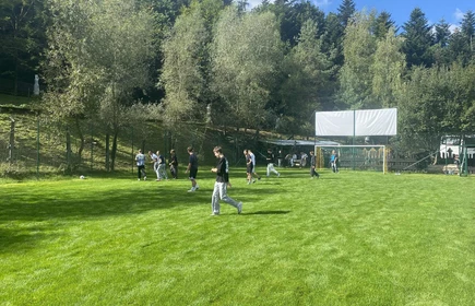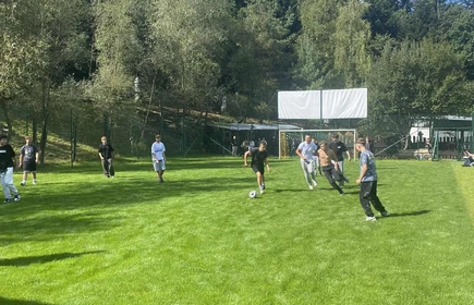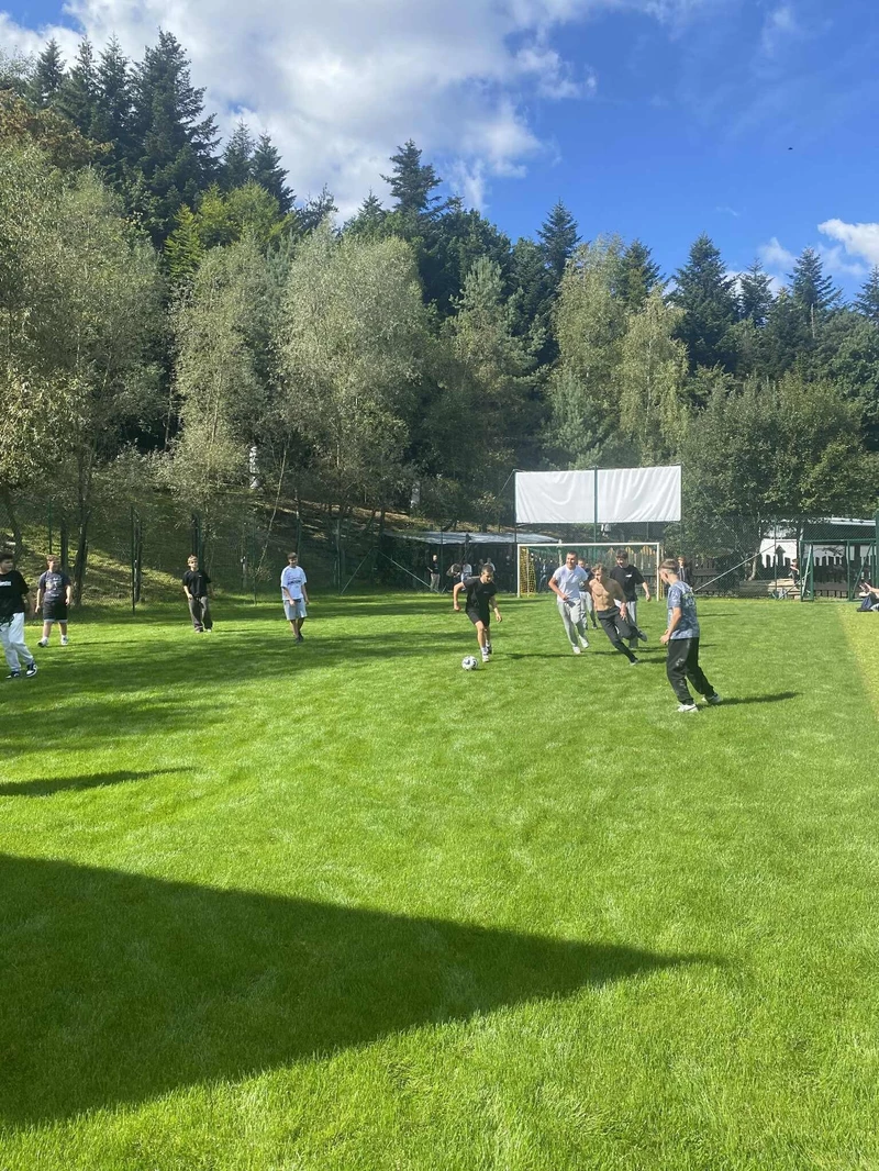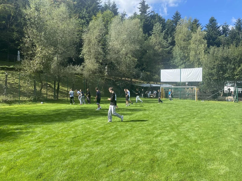 Potem przenieśliśmy się do Bacówki Biały Jeleń, gdzie czekało na nas ognisko. Kiełbaski, śpiew i rozmowy sprawiły, że atmosfera była naprawdę miła. Do tego każdy znalazł coś dla siebie – jedni podziwiali zwierzęta i otaczającą naturę, a inni z energią rozegrali mecz w piłkę nożną.