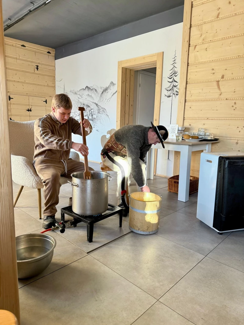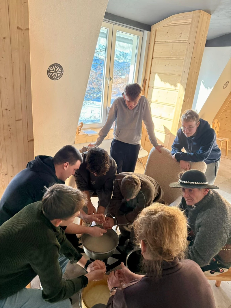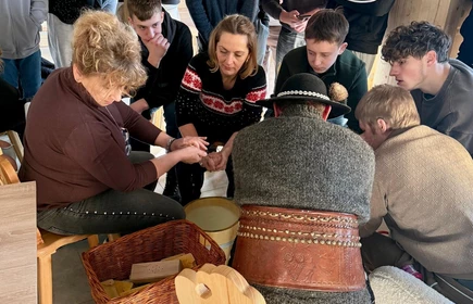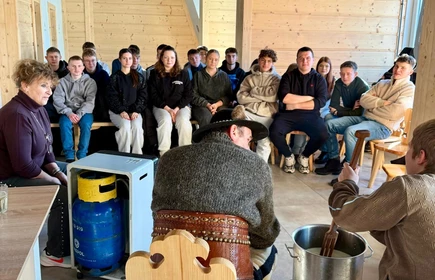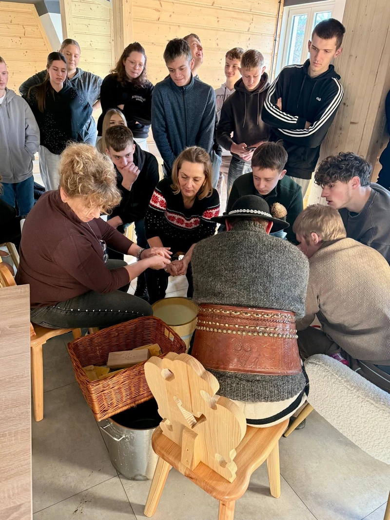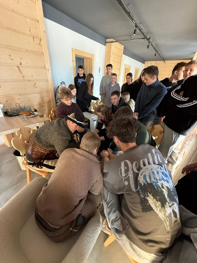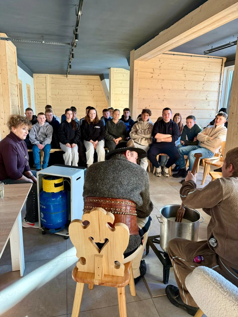 Pierwszym punktem programu były warsztaty edukacyjno-kulturalne w Domu Oscypka, podczas których młodzież – pod czujnym okiem bacy – poznała tradycyjne metody wytwarzania oscypka. Uczniowie dowiedzieli się, jak powstaje ten regionalny przysmak, a następnie mieli okazję samodzielnie wykonać własny ser, co dostarczyło im wielu wrażeń i świetnej zabawy.